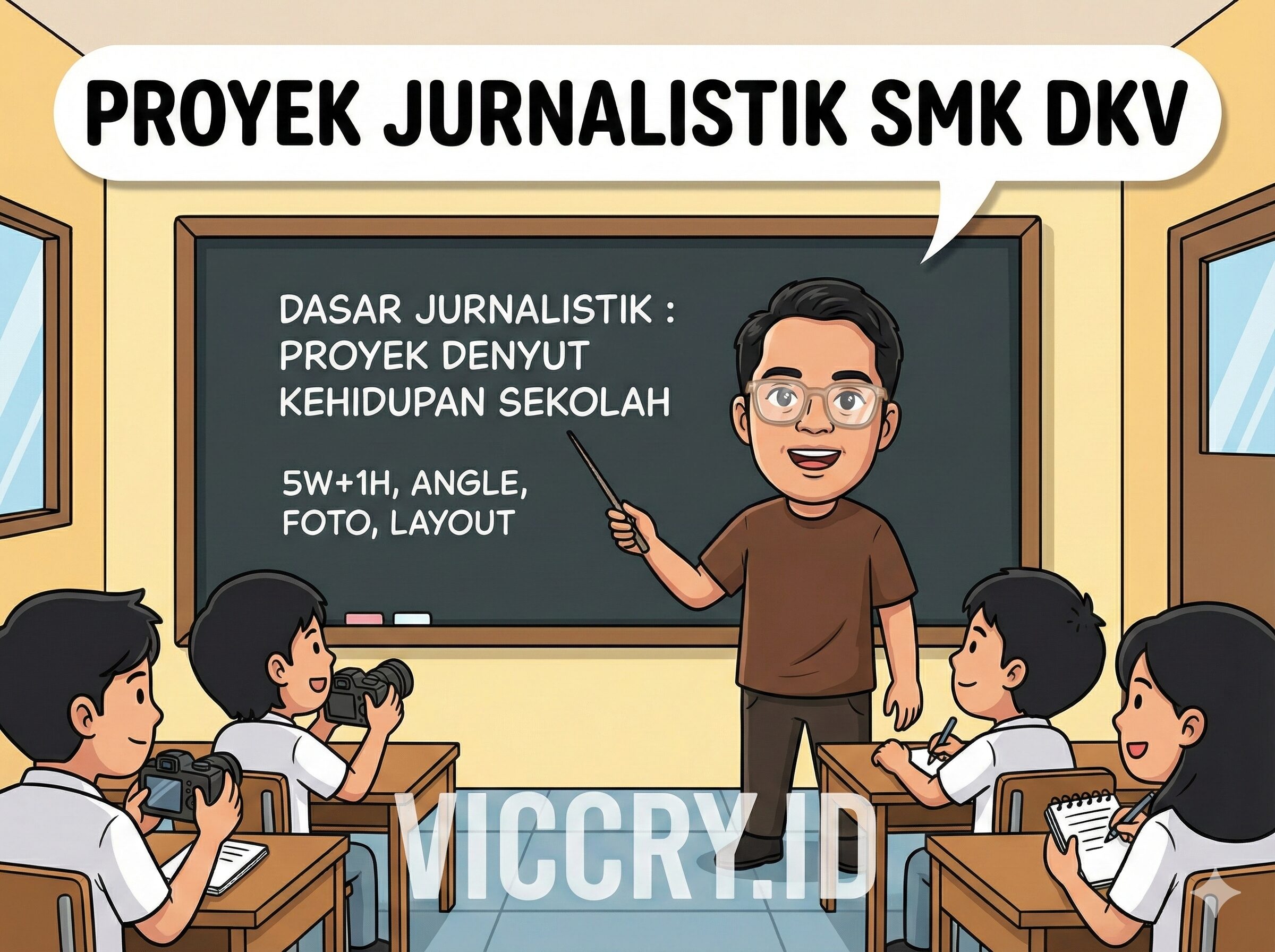 Melalui proyek “Denyut Kehidupan Sekolah” ini, kalian akan ditantang untuk terjun langsung mempraktikkan siklus kerja jurnalistik secara nyata. Mulai dari brainstorming ide, riset, wawancara, menulis berita, hingga mengemasnya dalam tata letak visual yang khas anak DKV banget! Objek liputannya? Tempat yang paling kita kenal: Sekolah kita sendiri.