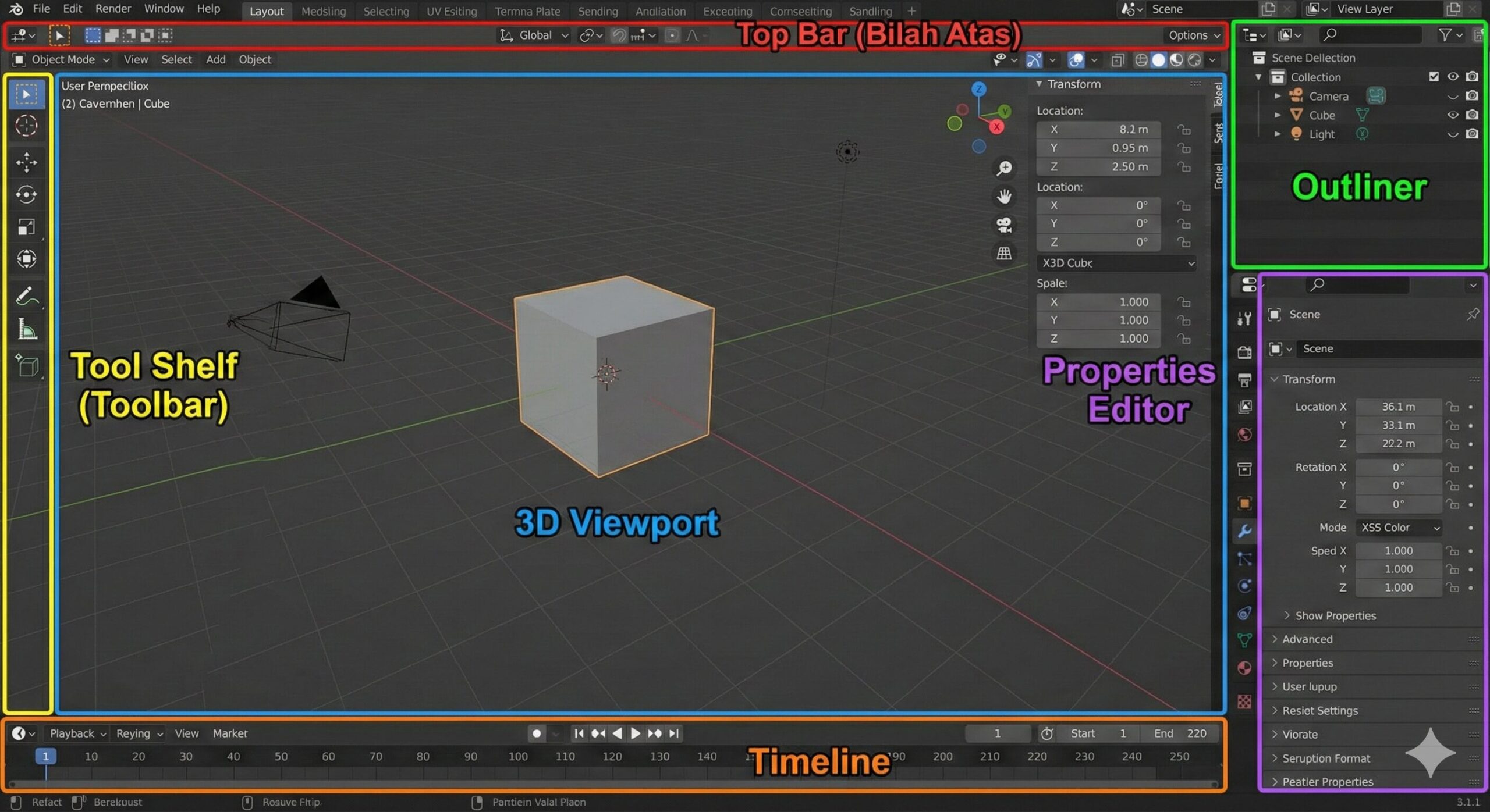 Properties Editor: Panel kontrol utama. Di sini Anda bisa mengatur segala hal, mulai dari resolusi render, material objek, hingga simulasi fisika.