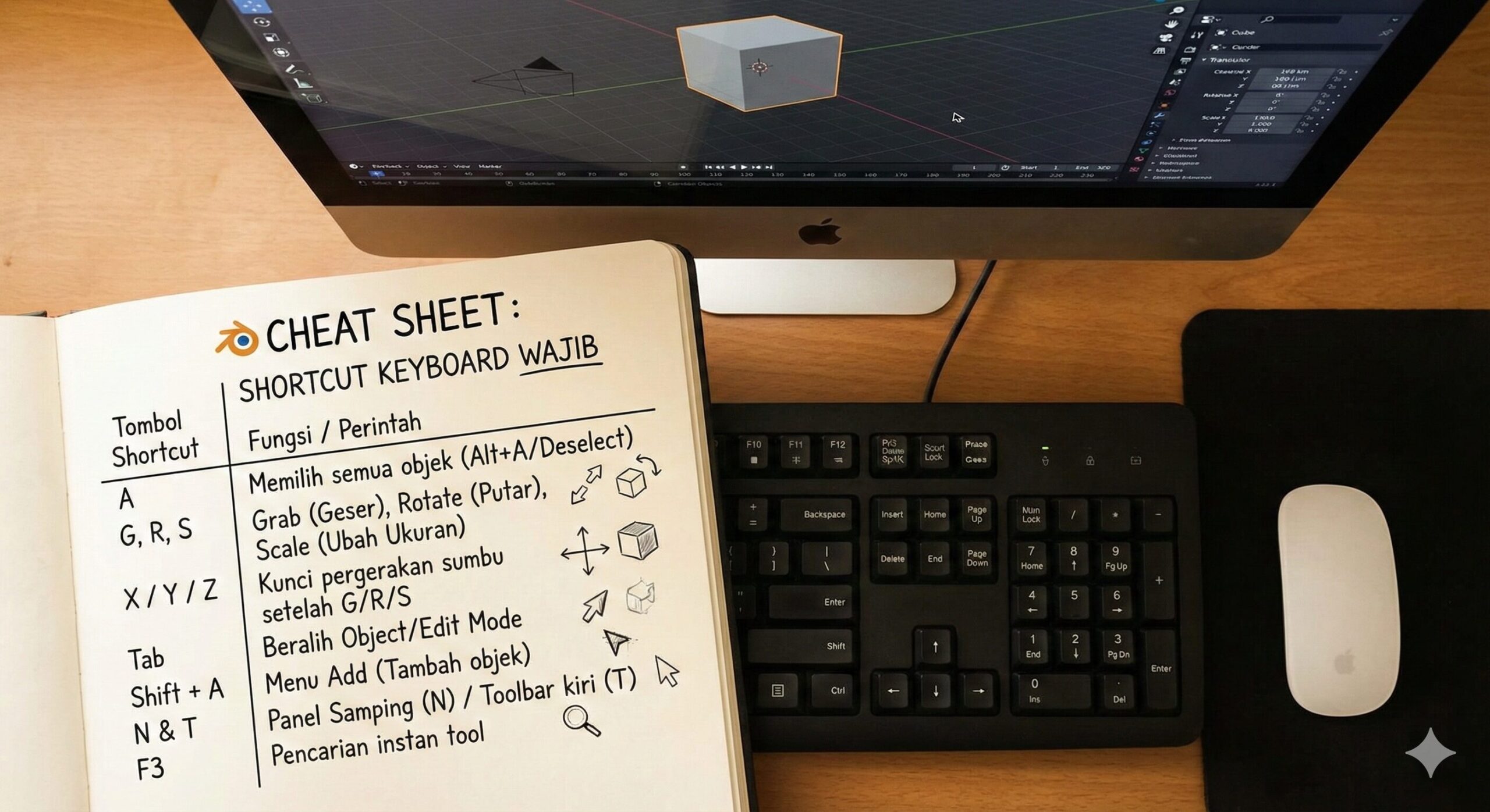 Pekerja 3D profesional sangat jarang mengklik ikon menu. Mereka menggunakan shortcut. Berikut adalah daftar shortcut esensial yang wajib Anda hafal untuk mempercepat kerja: