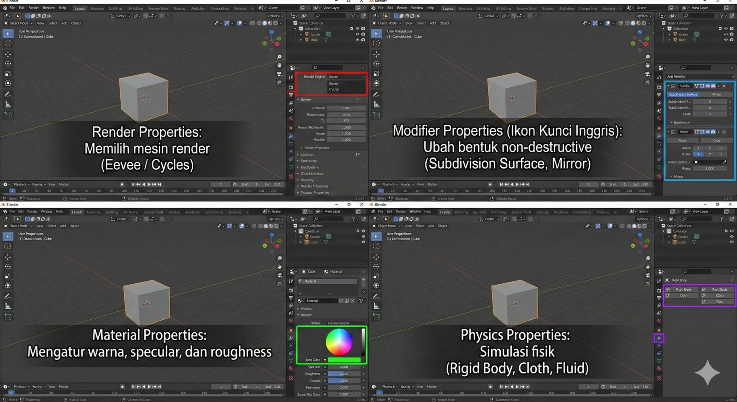 Modifier Properties (Ikon Kunci Inggris): Fitur luar biasa untuk mengubah bentuk objek secara non-destructive (bisa dibatalkan kapan saja). Contohnya: Subdivision Surface untuk menghaluskan objek, atau Mirror untuk membuat objek simetris.