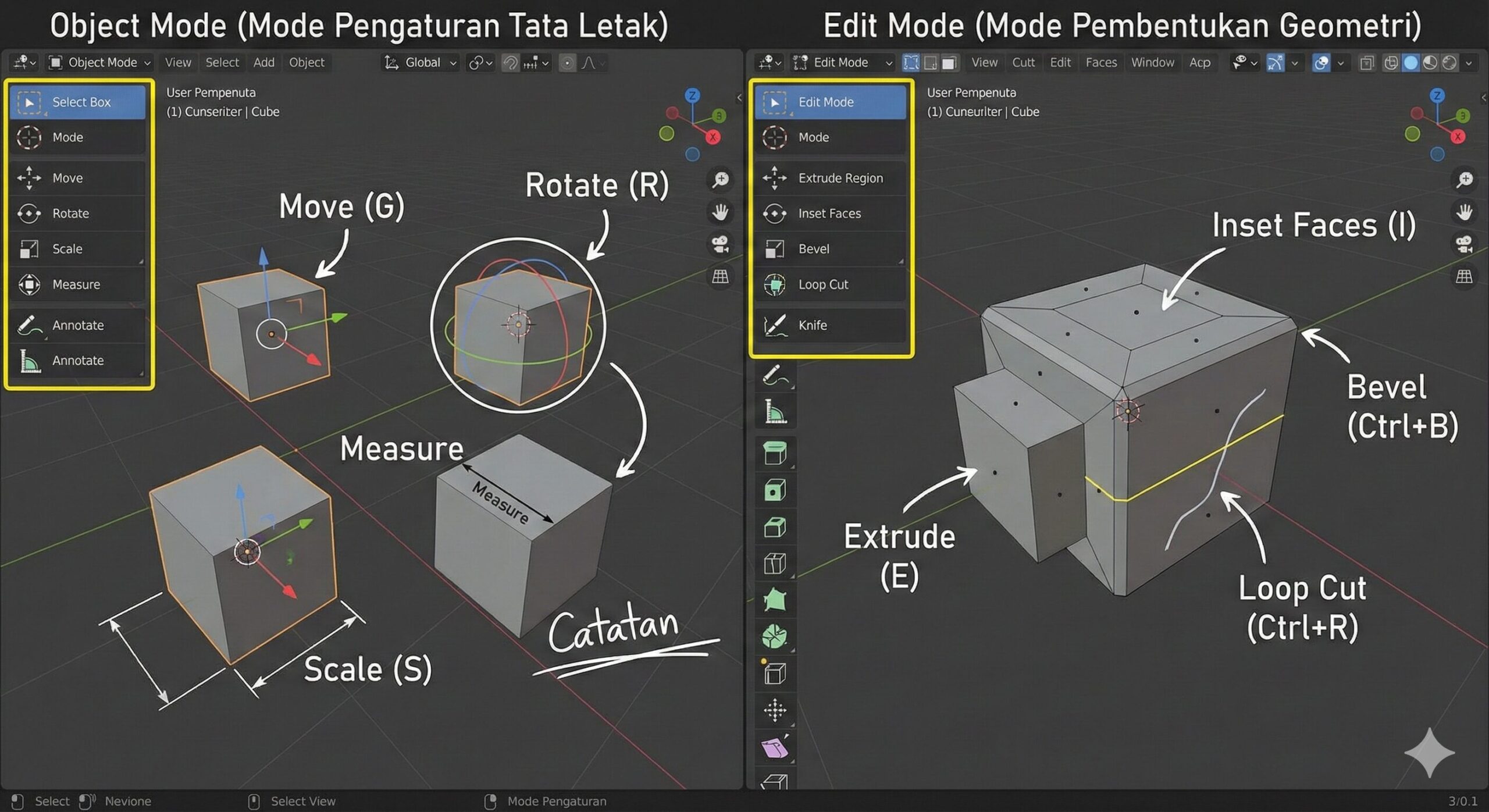 Move (G), Rotate (R), Scale (S): Tritunggal transformasi. Digunakan untuk memindah, memutar, dan mengubah ukuran objek.